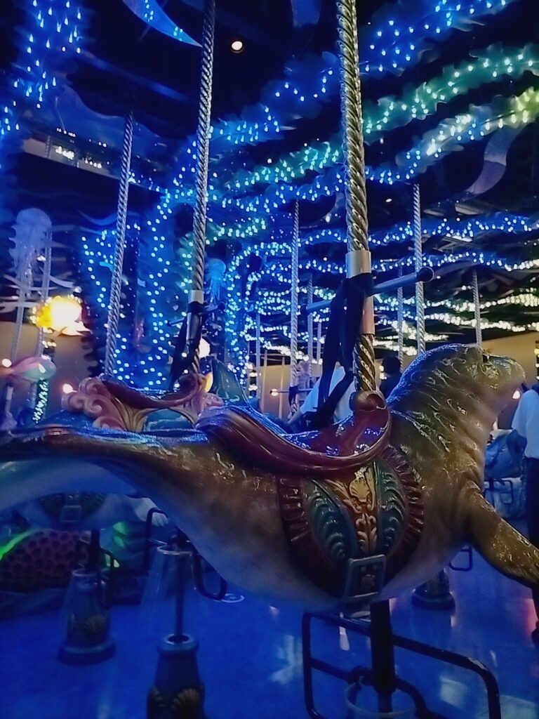 写真受け取りのあとには水族館バージョンのメリーゴーランドがあり、イルカやラッコがいてとってもかわいい!