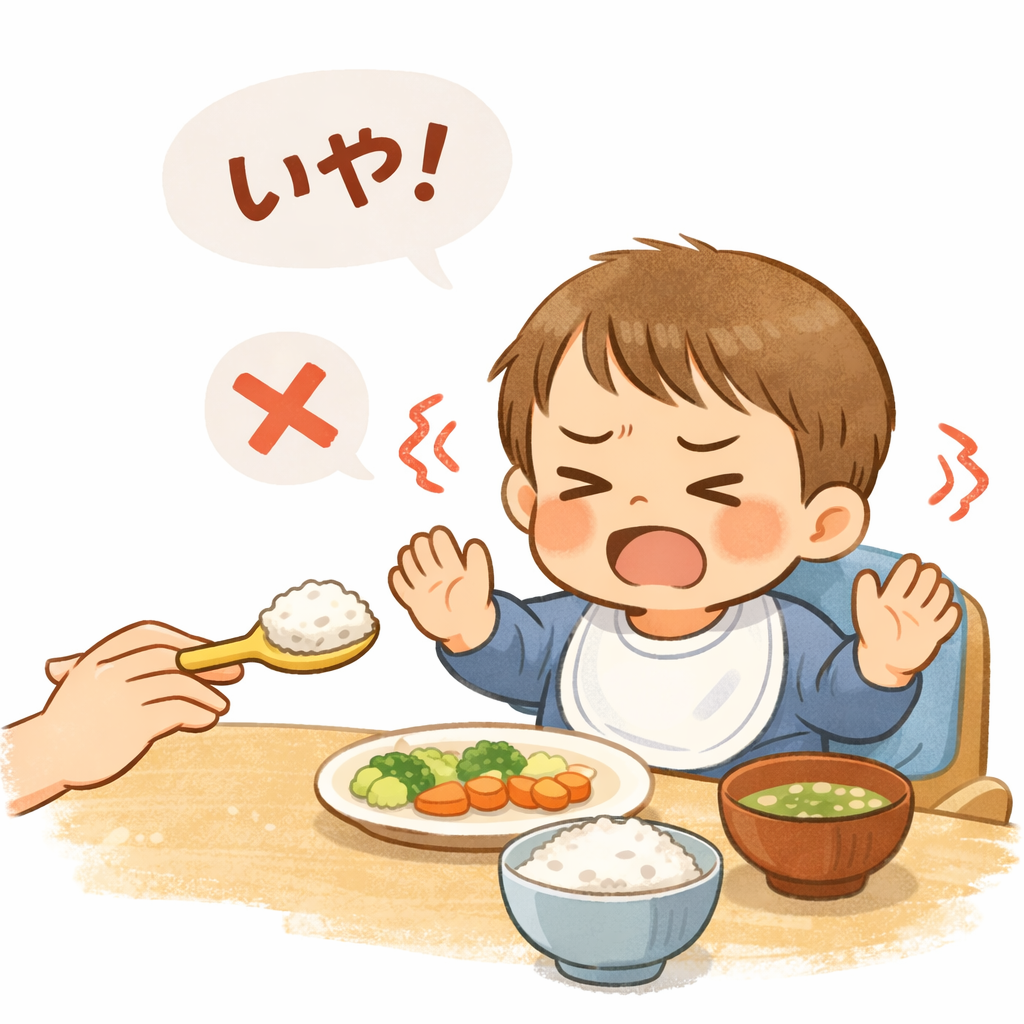スプーンを近づけると首を振ったり、一口食べてもすぐに「もういらない」の合図。